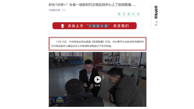 11月12日,中央电视台综合频道《新闻联播》栏目,对长春市九台区创新开展新时代文明实践中心建设试点工作取得的成果进行了关注报道。