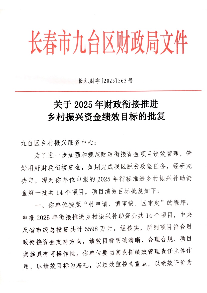 长春市九台区财政局关于2025年衔接资金项目绩效目标的批复