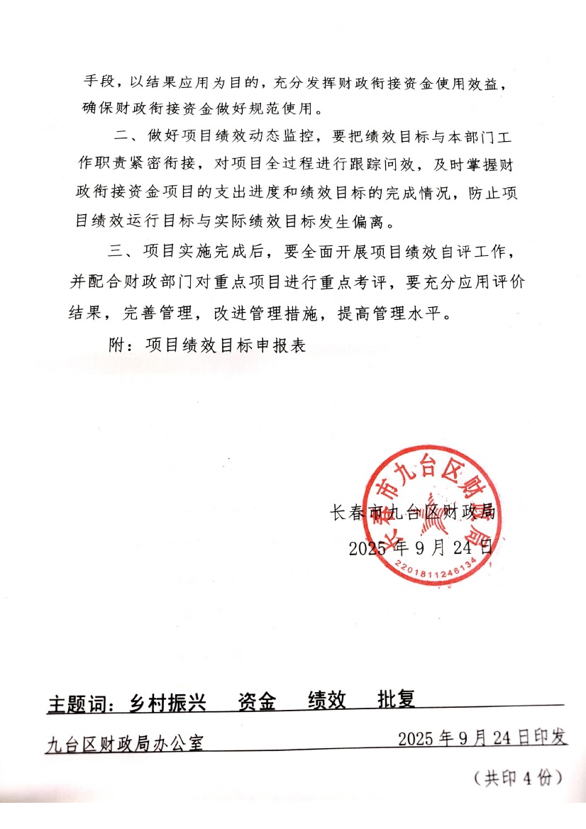 长春市九台区财政局关于2025年衔接资金项目绩效目标的批复