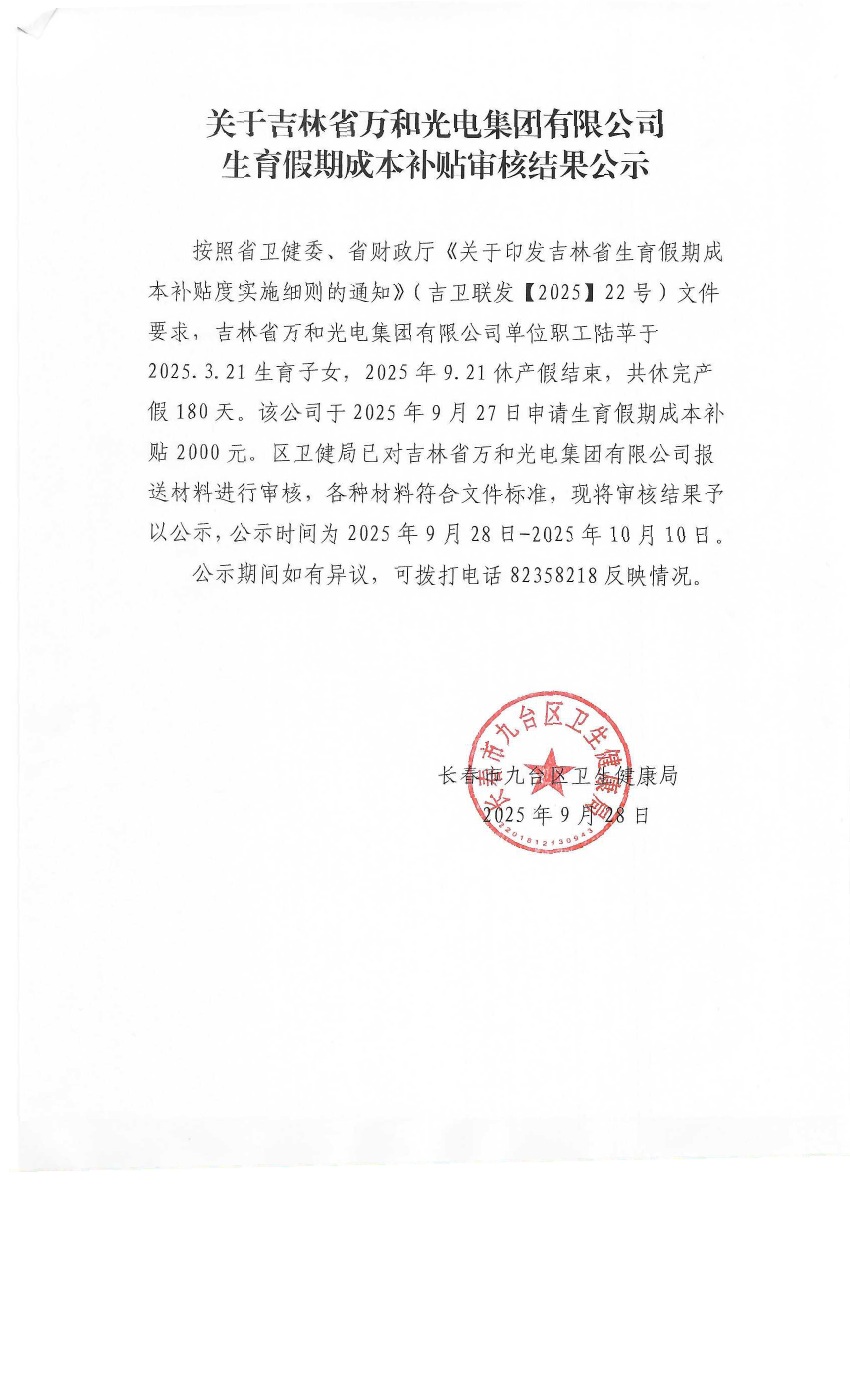 关于吉林省万和光电集团有限公司生育假期成本补贴审核结果公示