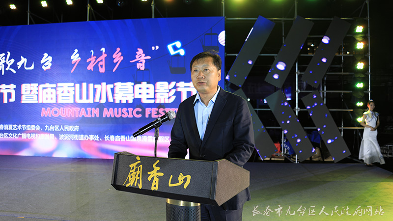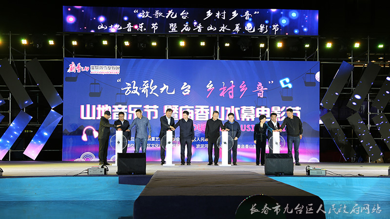 长春市政府秘书长赵显、长春市文广旅局局长曲笑,九台区委书记闫旭、区人大常委会主任王树民、区长宋长者等区领导共同为“放歌九台 乡村乡音”山地音乐节暨庙香山水幕电影节启幕。