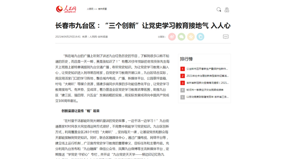 “在村里干活都能听到大喇叭里讲的党史故事,一边干活一边学习!”九台街道聂家村村民李大民觉得这种方式很好,不用集中就能学习党史知识。九台区创新方式,利用覆盖全区283个村的“大喇叭”,坚持每天一课,让基层党员和群众每天都能接触到党史知识。同时,联合区融媒体中心,通过广播电视、网络平台等,建立线上运行机制,广泛宣传党史学习教育的重要意义、目标任务和主要内容。充分利用九台发布和“九台融媒”微信公众号、凤舞九台微博等主流新媒体平台,定期推送“学党史 守初心”专栏,并开设“九台党史天天学——柳边印记红色九台”专栏,推出100个九台本地红色故事,让党史学习教育浸润人心。