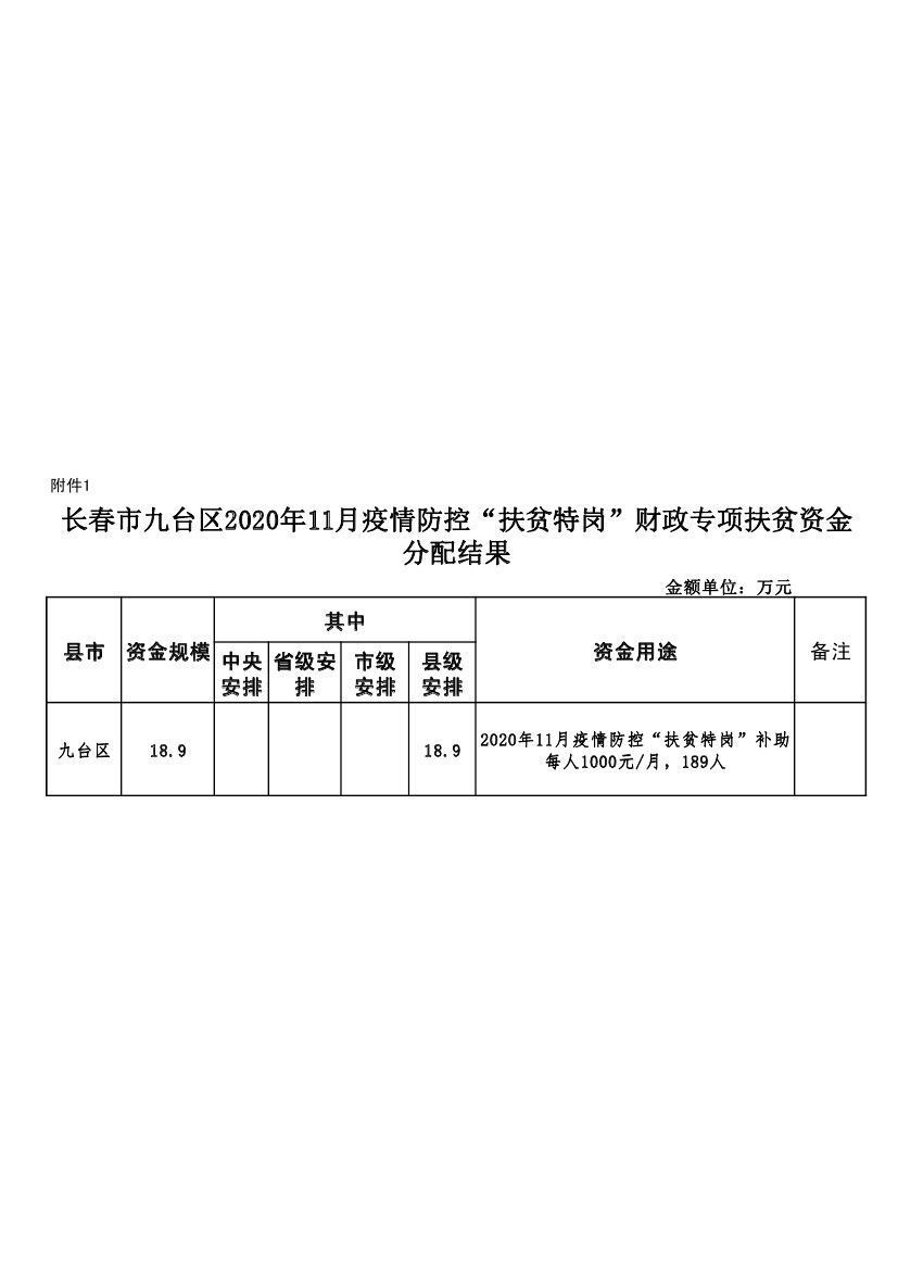 长春市九台区2020年11月疫情防控“扶贫特岗”补助扶贫资金分配结果公告