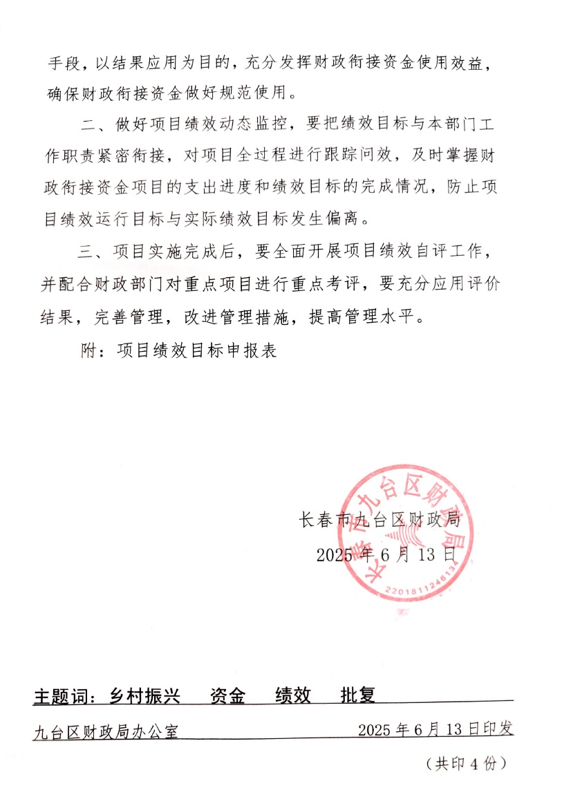 长春市九台区财政局关于2025年衔接资金项目绩效目标的批复